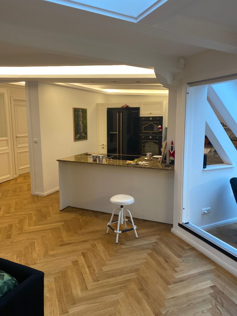 Ganz in der Nähe des bekannten Kurfürstendamms haben wir, die M&M Cuk GmbH, uns der Aufgabe eines anspruchsvollen Dachgeschossausbaus angenommen. Gemeinsam mit den Eigentümern entstand eine architektonisch außergewöhnlich schöne Wohnung, die modernes Design mit handwerklicher Präzision verbindet.