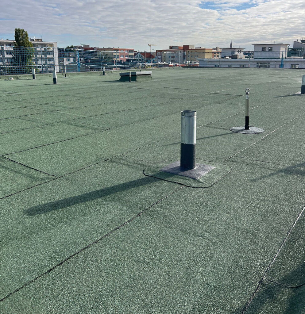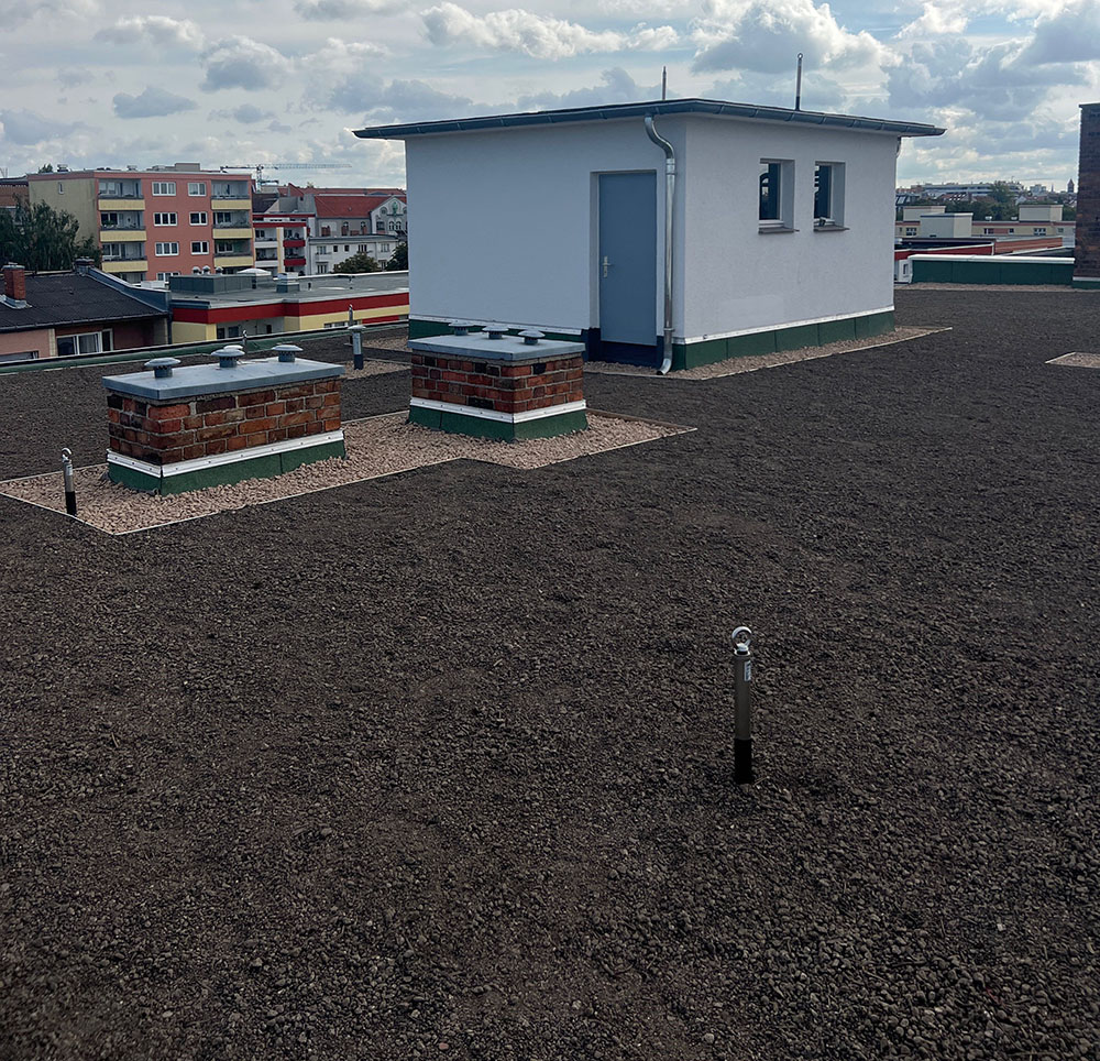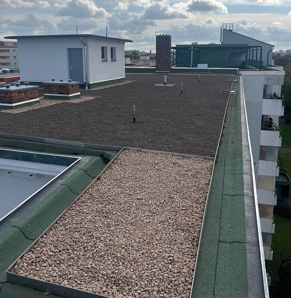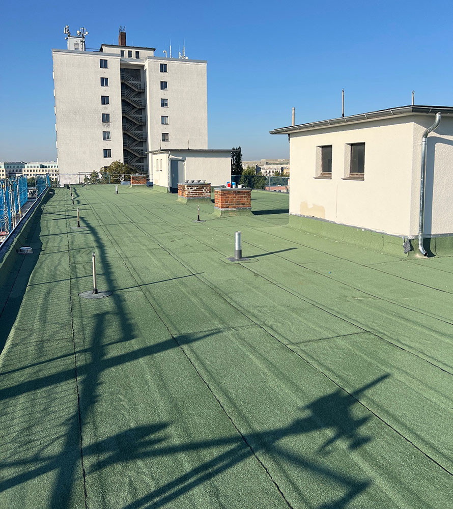Im Rahmen des Projekts führten wir die Modernisierung von rund 10.000 m² Flachdachflächen sowie die Sanierung und Begrünung von etwa 3.000 m² Gründachflächen durch. Darüber hinaus wurden umfassende Bauwerksabdichtungen umgesetzt, um die Gebäudehülle langfristig zu sichern und den heutigen Anforderungen an Energieeffizienz und Nachhaltigkeit gerecht zu werden.