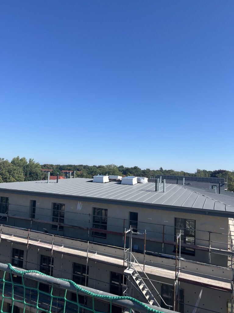 Unsere Arbeiten umfassten die Abdichtung und Dämmung von rund 6.000 m² Dachfläche sowie umfangreiche Klempnerarbeiten an Attiken und Entwässerungselementen. Mit präziser Ausführung und hochwertigen Materialien sorgten wir dafür, dass die Dächer nicht nur funktional und langlebig, sondern auch ästhetisch in das Gesamtbild des Quartiers eingebunden sind.